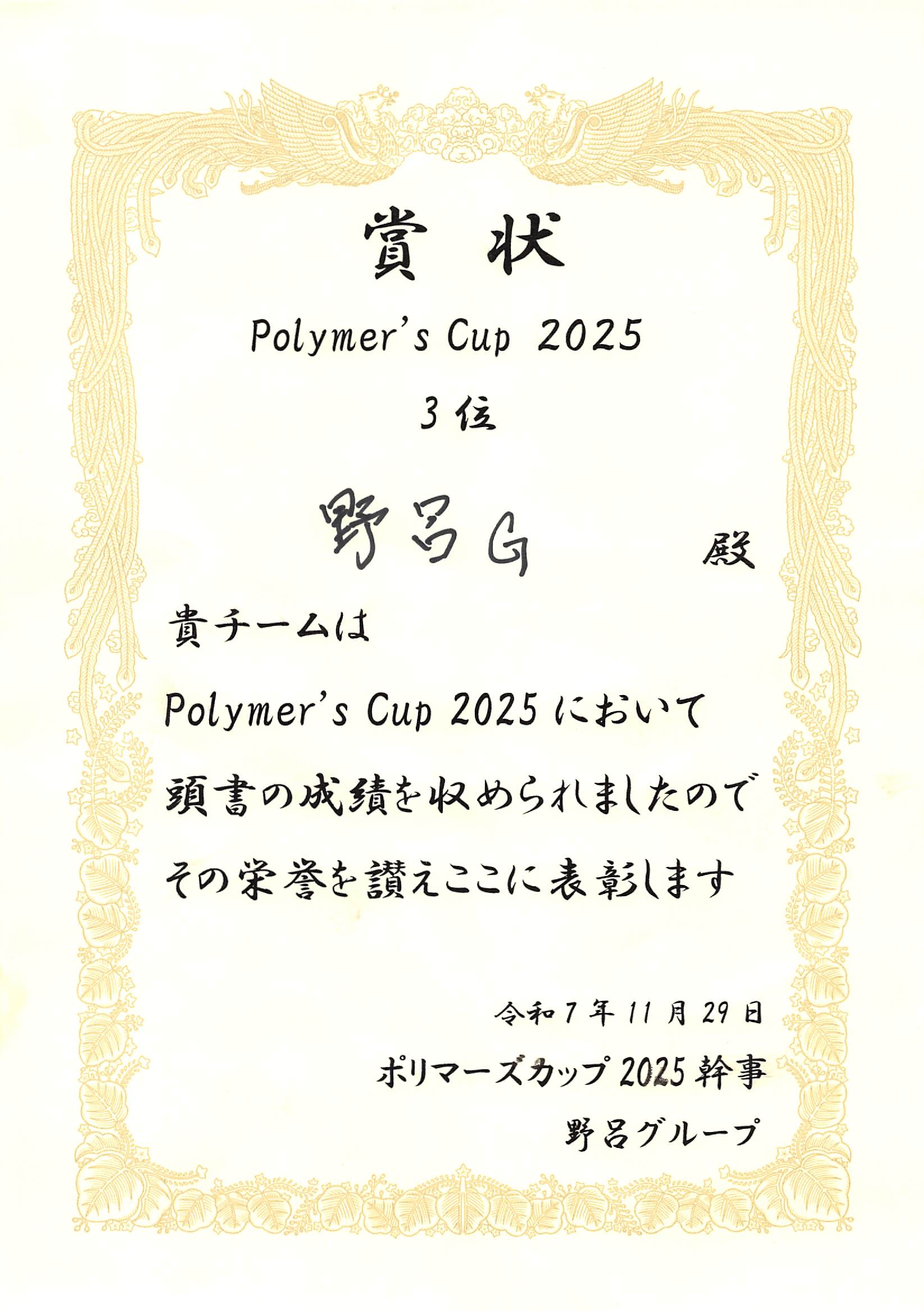 | 高分子関連研究室間対抗ソフトボール大会(ポリマーズカップ)で,当グループは第3位となりました.( ,) | |